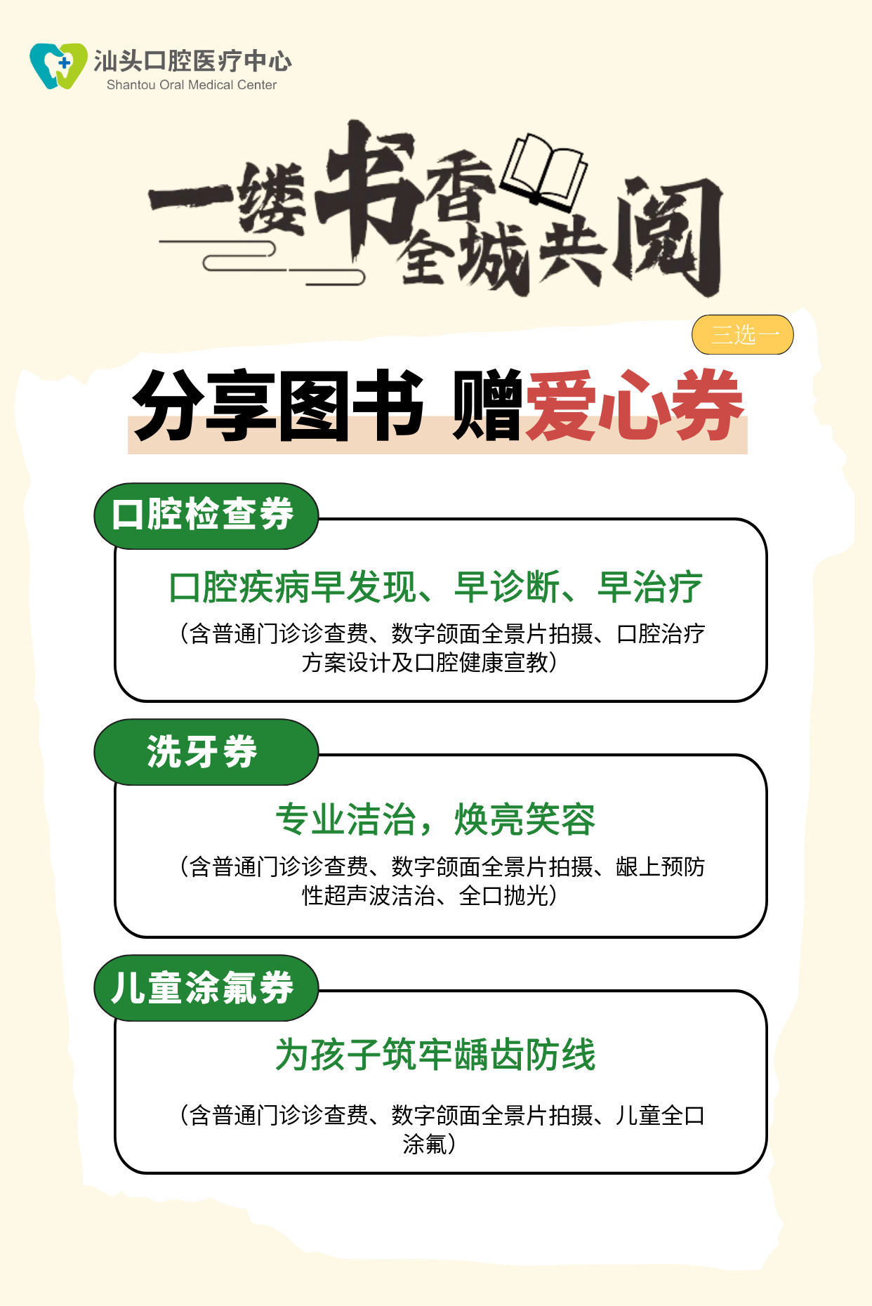 為感謝您的分享,汕頭口腔醫(yī)療中心也準備了一份健康好禮。單次分享3本及以上合格書籍,即可兌換一張電子版 “愛心券”(三選一):