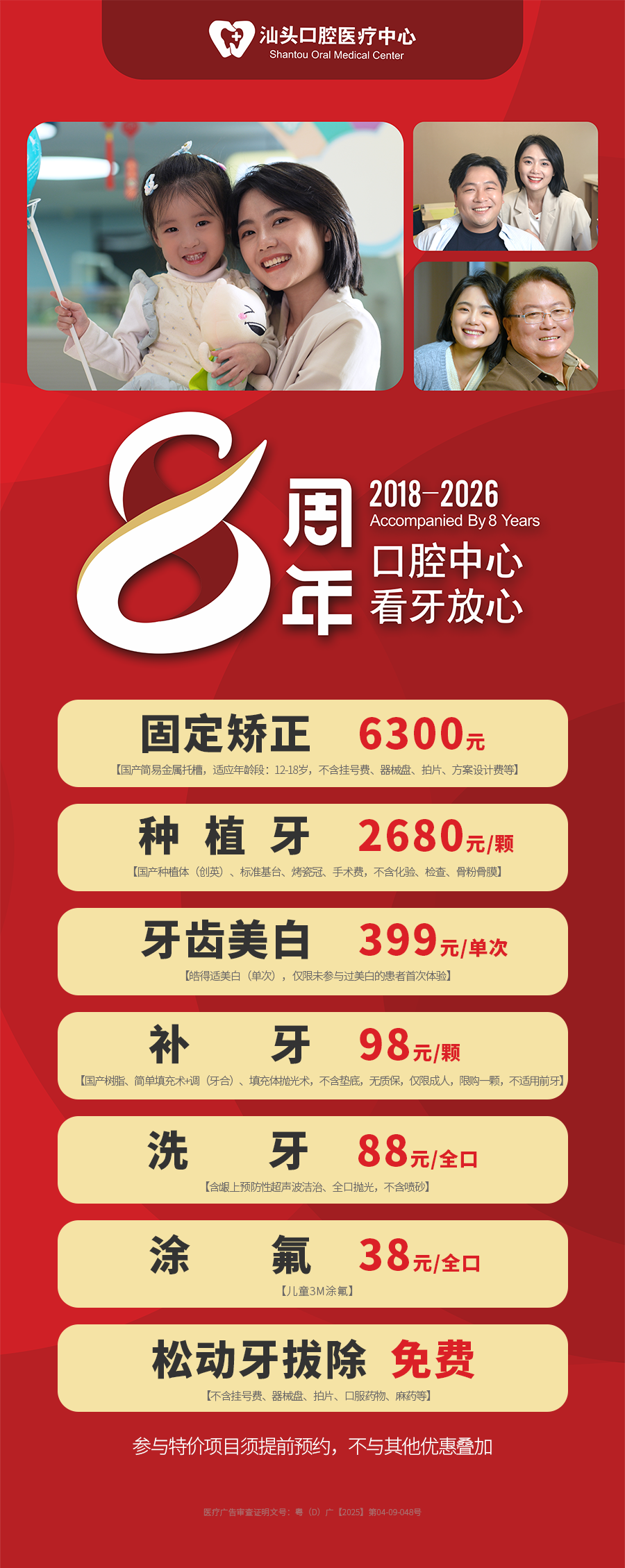 口腔健康是全身健康的基石,也是貫穿一生的重要課題。借著八周年的契機,我們立足惠民便民初心,聚焦不同年齡段、不同群體的口腔需求,推出惠民特價項目,既堅守“口腔中心,看牙放心”的診療品質(zhì)承諾,也切實降低大家的看牙成本,以全周期守護理念,讓每一位市民都能便捷享有優(yōu)質(zhì)口腔服務(wù),筑牢全家口腔健康防線。